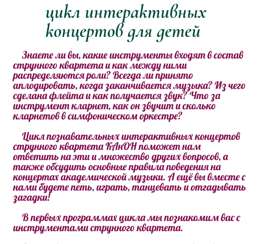 Познавательная интерактивная программа в лёгкой форме познакомит юных слушателей с инструментами струнного квартета и правилами поведения на концертах академической музыки. А ещё мы вместе будем петь, танцевать, играть и отгадывать загадки!